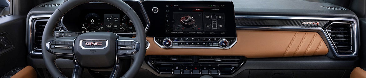 An 11.3-inch diagonal GMC Premium Infotainment System with Google built-in and an 11-inch color driver information center come standard. A 6.3-inch multicolor head-up display is available on the AT4 and Denali. All models provide Wireless Apple CarPlay and Android Auto compatibility, and wireless phone charging is available on the AT4 and standard on the Denali.