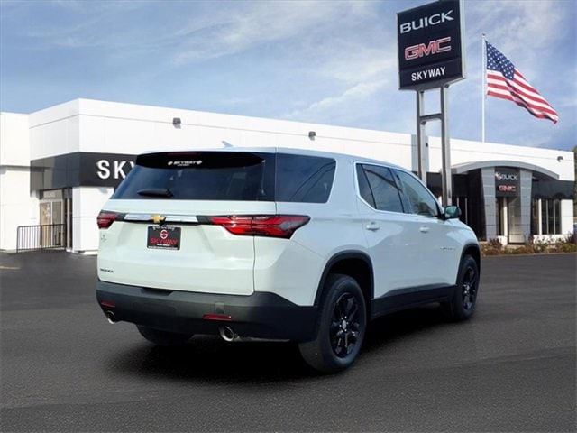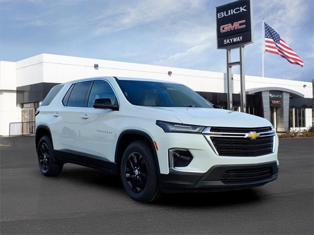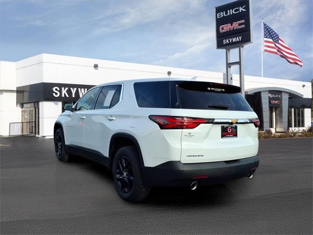 CARFAX One-Owner. LS Traverse LS, 4D Sport Utility, 3.6L V6 SIDI VVT, 9-Speed Automatic, FWD, Summit White, Jet Black/Chai Cloth, 2-Way Manual Front Passenger Seat Adjuster, 3.49 Axle Ratio, 3rd row seats: split-bench, 4-Wheel Disc Brakes, 6 Speakers, 6-Speaker Audio System Feature, 6-Way Manual Driver Seat Adjuster, ABS brakes, Air Conditioning, Alloy wheels, AM/FM radio: SiriusXM, Apple CarPlay/Android Auto, Auto High-beam Headlights, Automatic temperature control, Brake assist, Bumpers: body-color, Compass, Delay-off headlights, Deleted 3 Years of Remote Access, Driver door bin, Driver vanity mirror, Dual front impact airbags, Dual front side impact airbags, Electronic Stability Control, Emergency communication system, Exterior Parking Camera Rear, Four wheel independent suspension, Front anti-roll bar, Front Bucket Seats, Front Center Armrest, Front dual zone A/C, Front reading lights, Fully automatic headlights, Heated door mirrors, Illuminated entry, Low tire pressure warning, Occupant sensing airbag, Outside temperature display, Overhead airbag, Overhead console, Panic alarm, Passenger door bin, Passenger vanity mirror, Power door mirrors, Power steering, Power windows, Preferred Equipment Group 1LS, Premium Cloth Seat Trim, Radio data system, Radio: Chevrolet Infotainment System AM/FM Stereo, Rear air conditioning, Rear anti-roll bar, Rear reading lights, Rear window defroster, Rear window wiper, Remote keyless entry, Security system, SiriusXM Radio, Speed control, Speed-sensing steering, Split folding rear seat, Spoiler, Steering wheel mounted audio controls, Tachometer, Telescoping steering wheel, Tilt steering wheel, Traction control, Trip computer, Variably intermittent wipers, Voltmeter, Wheels: 18 Bright Silver Painted Aluminum. 3.6L V6 SIDI VVT FWD